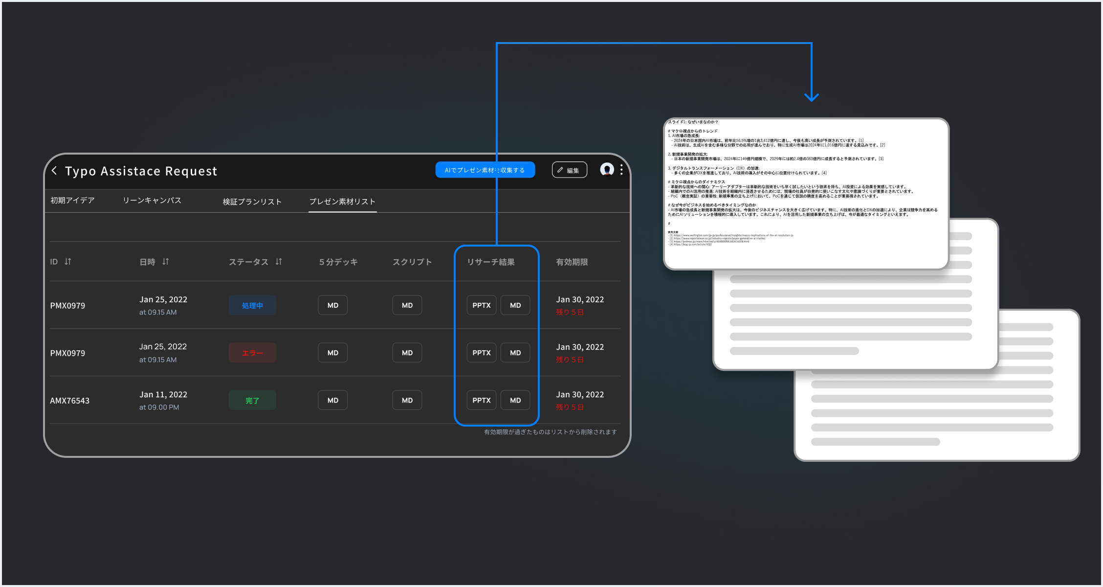 リーンキャンバスを基にプレゼン資料の原稿を自動作成し、上長報告、意思決定を速やかに実施することで円滑なプロジェクト進行を実現。